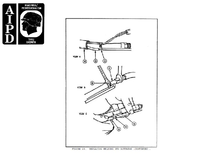PROCURE NEW ACTUATOR AND REASSEMBLE WELDING GUN AS FOLLOWS: Step 1. Using two wrenches, screw the threaded end of the welding gun tube (6), shown in figure 25, view B, into the cable assembly fitting (15). Step 2. Moisten the copper tubing (14), shown in figure 25, view C, and slide the gas hose (13) over the copper tubing approximately 1/2 inch. Approximately one inch of copper tubing should be exposed beyond the end of the gas hose tubing. Step 3. Plug the two terminals (10), shown in figure 26, view A, on page 60, into two pushbutton switch terminals (