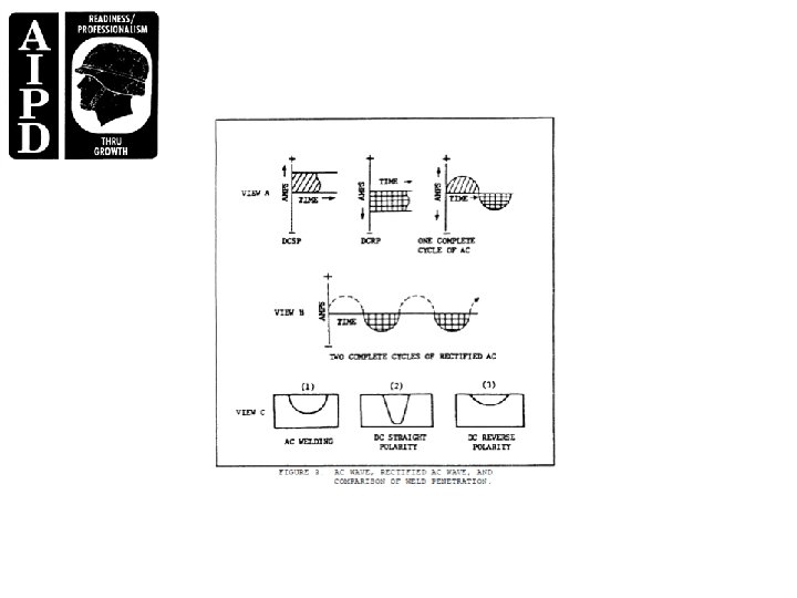 (3) Alternating Current. (a) Alternating current welding, theoretically, is a combination of dcsp and dcrp welding. This can be best explained by showing the three current waves. As shown in figure 3, view A, on the following page, half of each complete alternating current cycle is dcsp, and the other half is dcrp. (b) Moisture, oxides, scale, etc. , on the surface of the plate tend to prevent, partially or completely, the flow of current in the reverse polarity direction. This is called rectification. For example, if no current at all flowed in the reverse polarity direction, the current wave would look something like that shown in figure 3, view B