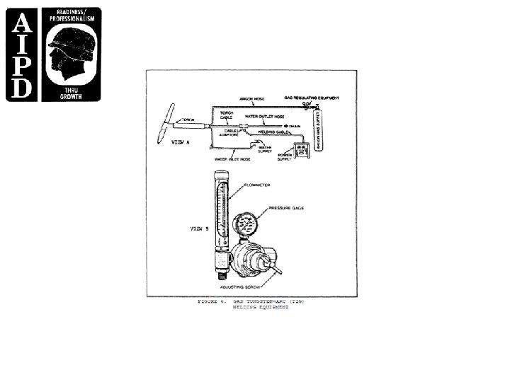 (7) Tee Joint. All tee joints require the addition of a filler rod to provide the necessary build-up of metal between the work pieces of base metals being welded. The number of passes on each side of the joint will depend upon the thickness of the base metal (the material being welded) and the size of the weld desired. When 100 percent penetration is required, be sure that welding current values are adequate for the thickness of the base metal. i. Equipment (figure 6 on page 20). (1) The basic equipment requirements for manual TIG welding are shown in view A of figure 6 and consist of the welding torch, an electrical power supply, shielding gas, and a water supply. Safety equipment should be used for protection against the arc rays during welding operations