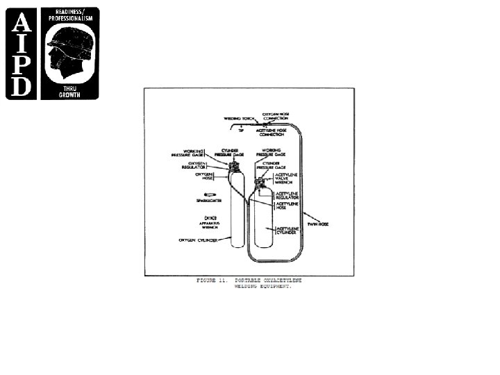 troubleshooting and repair, are described in subsequent paragraphs only for oxyacetylene and inert gas welding equipment. 2. Oxyacetylene Welding Equipment a. General. It is understood that both stationary and portable oxyacetylene welding equipment exist. However, this paragraph describes only the portable oxyacetylene welding equipment, shown in figure 11 on the following page, which is allocated to IDS and IGS units in the field. The portable oxyacetylene welding outfit consists of an oxygen cylinder and an acetylene cylinder with attached valves, two regulators, two sets of gages, and two lengths of hose. This equipment may be temporarily secured on the floor, or mounted in a two-wheel all welded steel truck equipped with a platform which will support two large size cylinders. The cylinders are secured by chains attached to the truck frame. A metal box welded to the frame provides for storage of the cutting torch, tips, sparklighter, gloves, fluxes, goggles, and necessary wrenches.