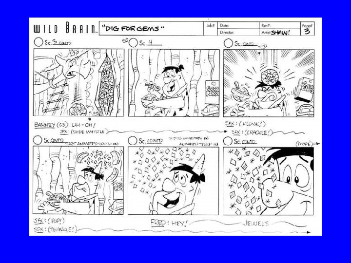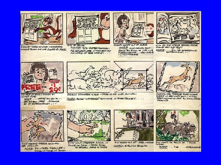 Storyboards • The film in outline form – specify the key scenes – specify the camera moves and edits – specify character gross motion • Typically paper and pencil sketches on individual • Sheets taped on a wall • Still not very many computers…