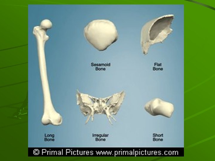 Classification of Bones 5 Types of bones classified according to their shape. 1. Long Bones: found in the arms and legs. Femur is a long bone. 2. Short Bones: most common in the wrists and ankles. Carpals, Tarsals 3. Flat Bones: flat and thin and often protect vital organs from injury. (Skull Bones) 4. Irregular Bones: odd looking bones. (Vertebrae) 5. Sesamoid Bones: unusual bones that are small and flat wrapped within tendons that move over bony surfaces. (patella)