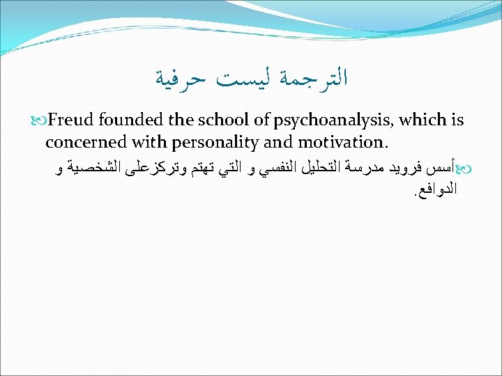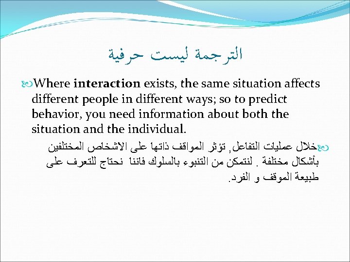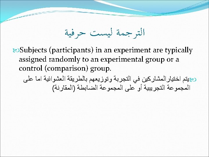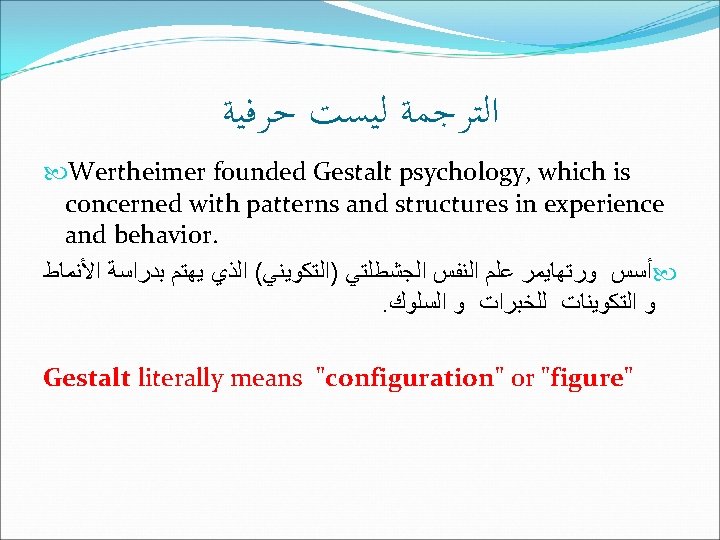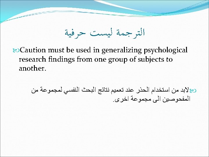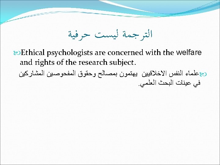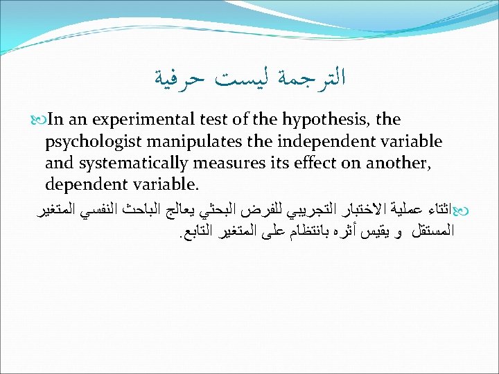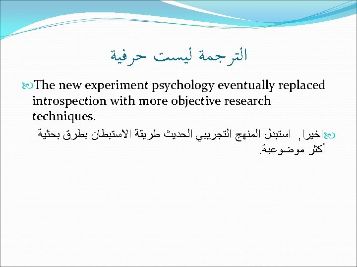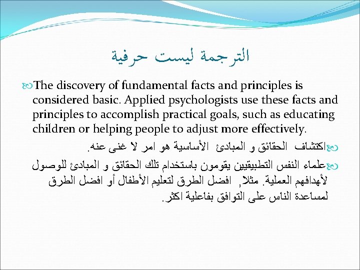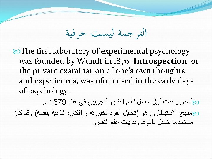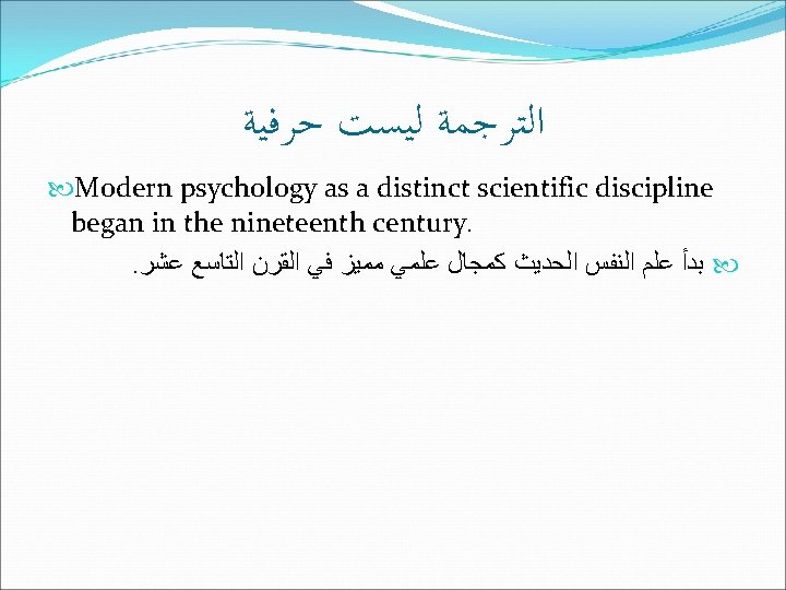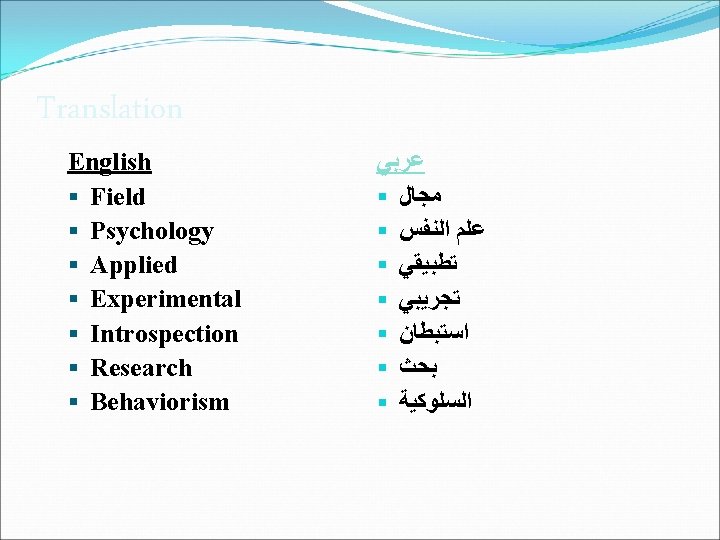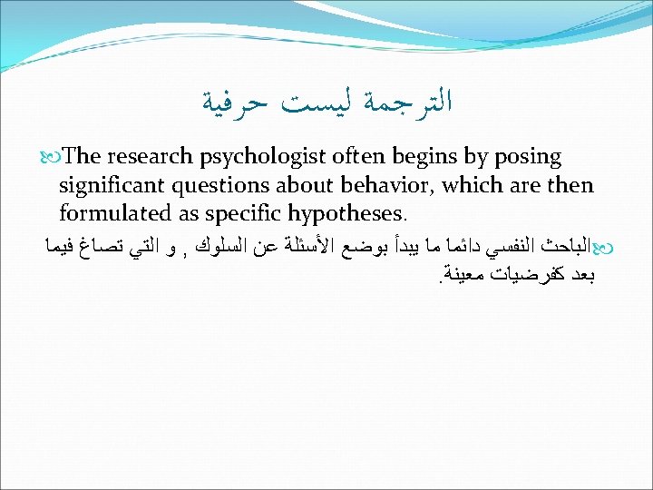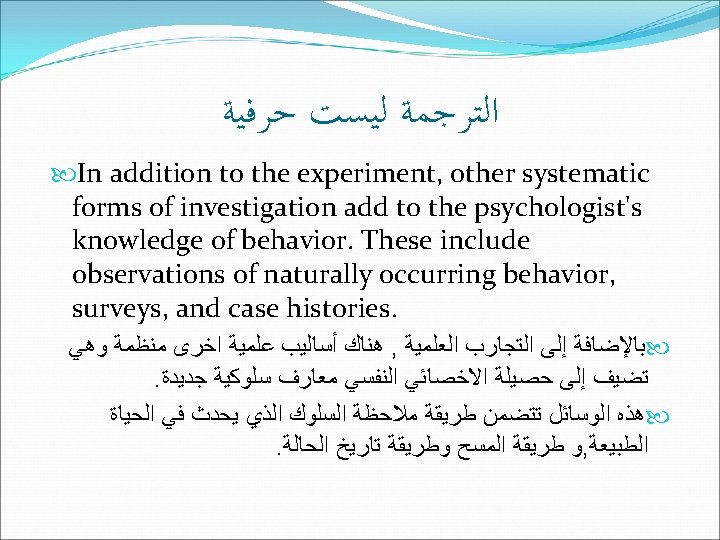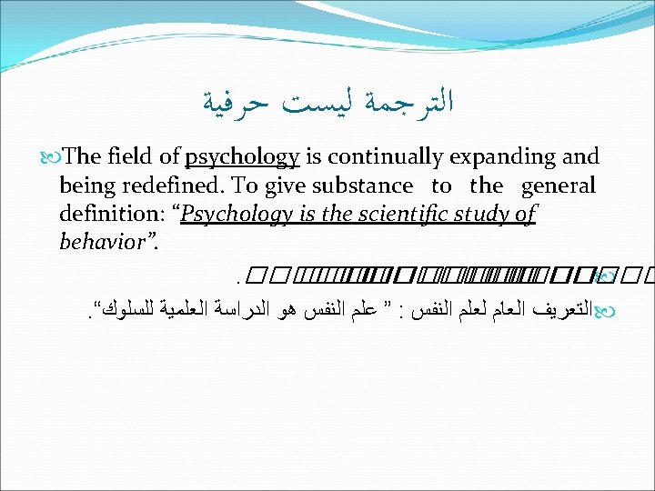 Lesson 1 The Science of Psychology Translation English Slides: 27 Download presentation Lesson 1: The Science of Psychology Translation English § Observation § Hypothesis § Interaction § Research Findings § Behavior ﻋﺮﺑﻲ § ﻣﻼﺣﻈﺔ § ﻓﺮﺿﻴﺔ § ﺗﻔﺎﻋﻞ § ﻧﺘﺎﺋﺞ ﺍﻟﺒﺤﺚ § ﺳﻠﻮﻙ Environment Interactions ﺍﻟﺒﻴﺌﺔ ﺍﻟﺘﻔﺎﻋﻼﺕ