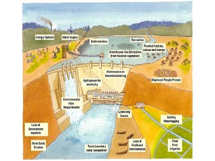 Dams What is a dam? - a barrier that holds water back What is it used for? - it produces electricity and acts as a water supply Pros: - Provides energy and jobs to homes and people - Creates recreational activities - Prevents Flooding Cons: - Home loses and displacement of people - Flooding - Disrupts the environment, habitat, and ecosystem