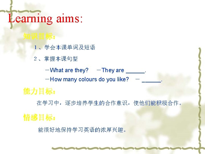 Listen and answer: (Before listening, give them some questions to answer. ) 1. How many colours do you hear form the tape? Four. What are they? They are red, blue, yellow, green. 2. Does Danny like three colours? No, he doesn’t.