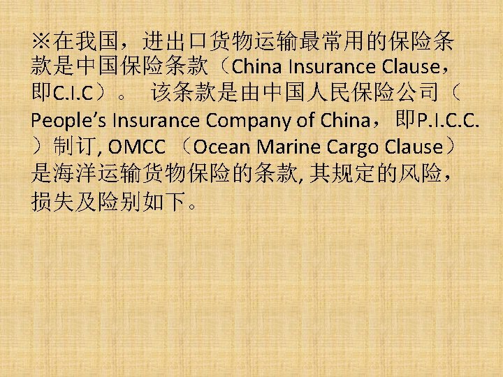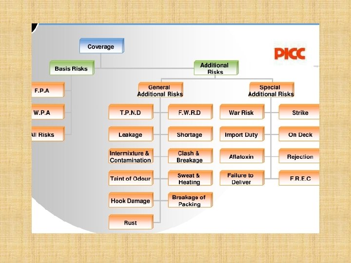 ※We usually insure against All Risks for the invoice value plus 10%. ※We’d rather cover 130% of the invoice value. c. Insurance premium ※We’ve covered insurance with PICC at a premium of 5‰. ※As a rule, the extra premium involved will be for buyer's account. 2. Describe the basic risks and additional risks covered by PICC ※OMCC provides coverage of three basic risks, some additional risks and some special additional risks.