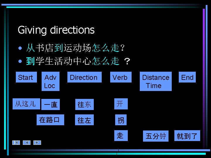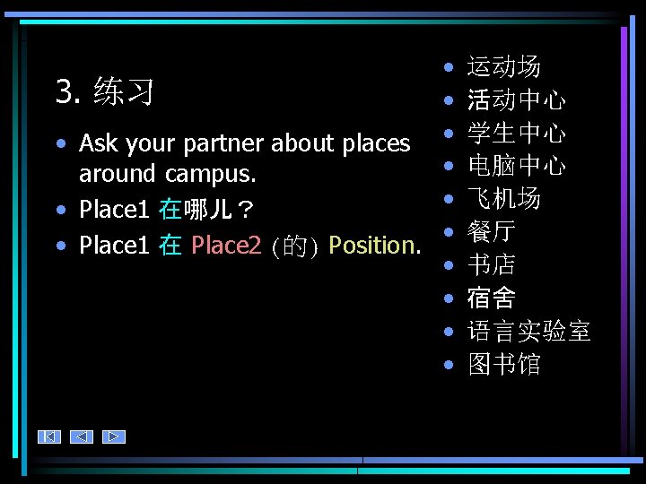 Places 1. 练习 • 运动场 • 活动中心 • Ask your partner how far/near different places • 学生中心 • 飞机场 are from each other. • 餐厅 – Place 1 离 Place 2 远吗? • 书店 – Place 1 离Place 2 近 吗? – Place 1 离Place 2 远不远? • 宿舍 • Vary your responses as • 语言试验室 much as possible. • 图书馆