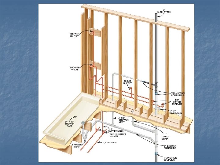 What is needed for the plumbing supply system? n If a supply line branches off to supply more than one fixture, the rule of thumb is a ¾ inch line can supply three ½ inch lines and a ½ inch line can supply three 3 /8 inch lines.