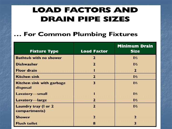 What is needed for the plumbing drain-waste-vent system? n The amount of liquid that can flow from a fixture is the basis for determining the size of drain-waste piping. n The load factor is the number of gallons of water that must be discharged per minute from a fixture or group of fixtures.