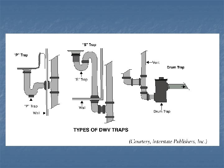 What is needed for the plumbing drain-waste-vent system? n Traps also help stop air from entering the waste pipe while liquid is flowing and thus eliminate noise. Traps may be P, S, or drum.