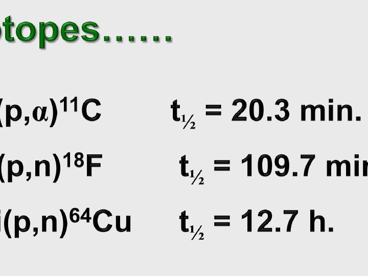Special properties of 99 Tcm • 142. 7 ke. V gamma ray just perfect for imaging • 6 hour t 1/2 minimizes radiation dose yet is tractable for hospital procedures • 10 million procedures per year in the US