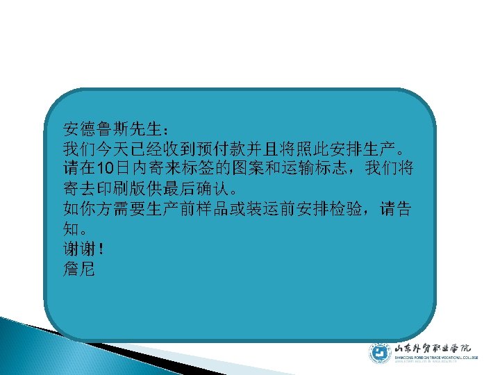 补充信文 Dear Mr. Field, Please see the following and come back to us on Monday. Packaging (again): The customer shipped the sample units via UPS all over the country & two came back damaged, so now they are requesting the following additions: (1)Wrap each resin elf (树脂小精灵) in bubble wrap to protect them better. 中文翻译