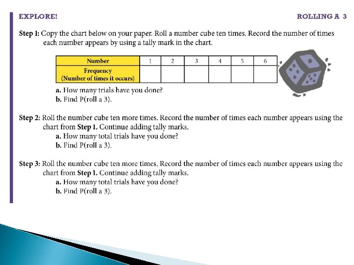 Exit Problems 1. Identify the sample space: Tom rolls a regular sixsided number cube. 2. Sherlock put his music player on random play. It chose the same song 3 out of the last 12 times it played a song. What is the experimental probability it will play the same song for its next selection? 3. Charlie made 4 out of 5 free throws at basketball practice today. What is the experimental probability he will make a free throw at the game tonight?