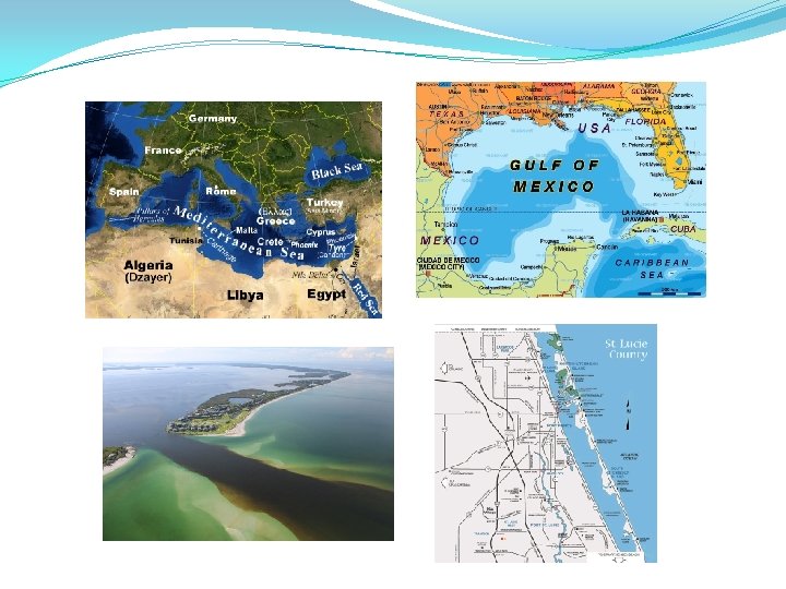 Smaller Divisions of the Ocean Sea: a smaller body of salt water that is almost completely surrounded by land Example: Mediterranean Sea Gulf: a smaller body of salt water that is partially surrounded by land Example: Gulf of Mexico Estuary: inlet area where salt water meets fresh water Example: St. Lucie Estuary Lagoon: body of water composed of brackish water- a mixture of salt & fresh Example: Indian River Lagoon