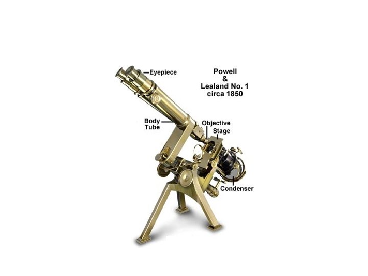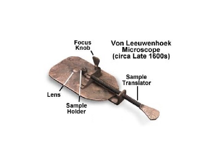 Anton von Leeuwenhoek Father of microscopy • “simple” microscope • • Single lens microscope • could magnify to about 275 x �single-celled animals ("animalcules") �interior of cells 1673 ~1674