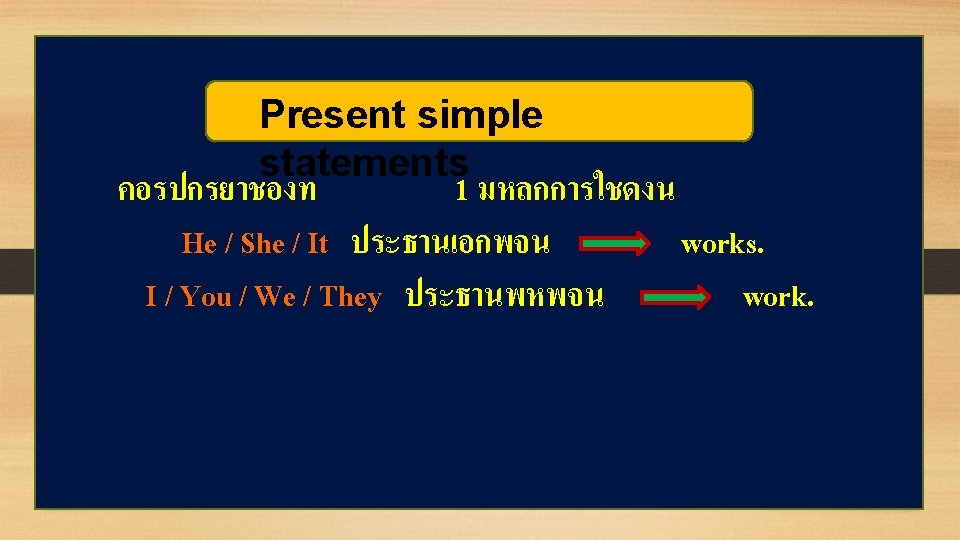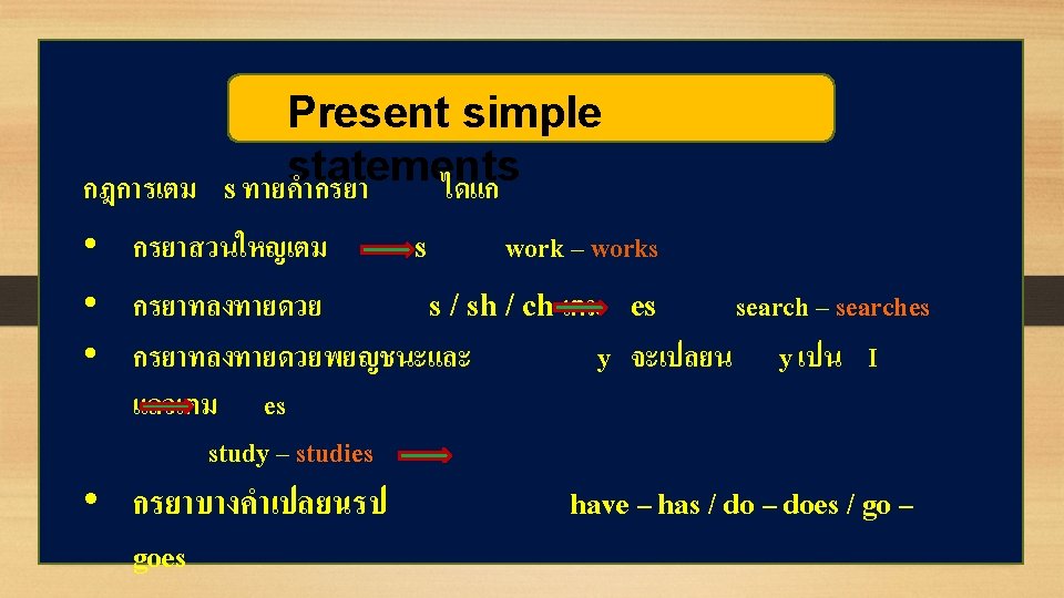 Present simple statements Present simple ใชเลาความจรงทางธรรมชาต ขอเทจจรงโดยทวไป นสย หรอกจวตรประจำวน - He gets up at six o’clock. - I take the bus to school every day. - We like strawberry cakes.