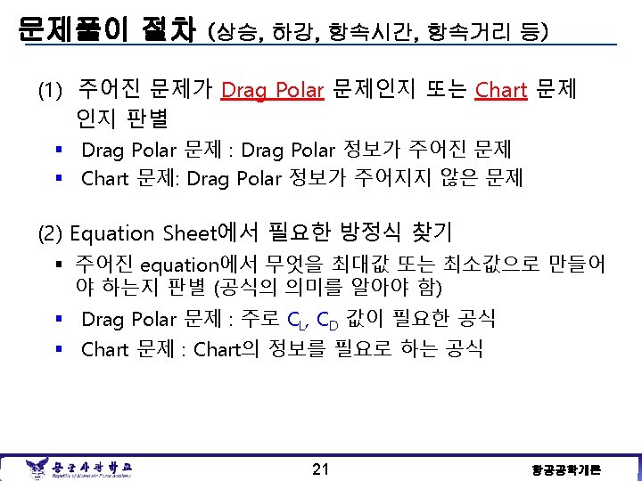 Some Relationships Case Equation Relation between CDo & KCL Graphical Max Rate of Climb No Set Relation Find greatest distance between PA and PR Max Climb Angle CDo = k. CL 2 Find greatest distance between TA and TR Max Range Average Value Formula or CDo = 3 k. CL 2 (D/V)Min CDo = k. CL 2 TR, Min (L/D)Max Glide Range CDo = k. CL 2 TR, Min (L/D)Max Min Sink Rate 3 CDo = k. CL 2 PR, Min Breguet Range Eq. 5. 27 Max Endurance Average Value Formula or Breguet Endurance Eq. 5. 27 20 항공공학개론
