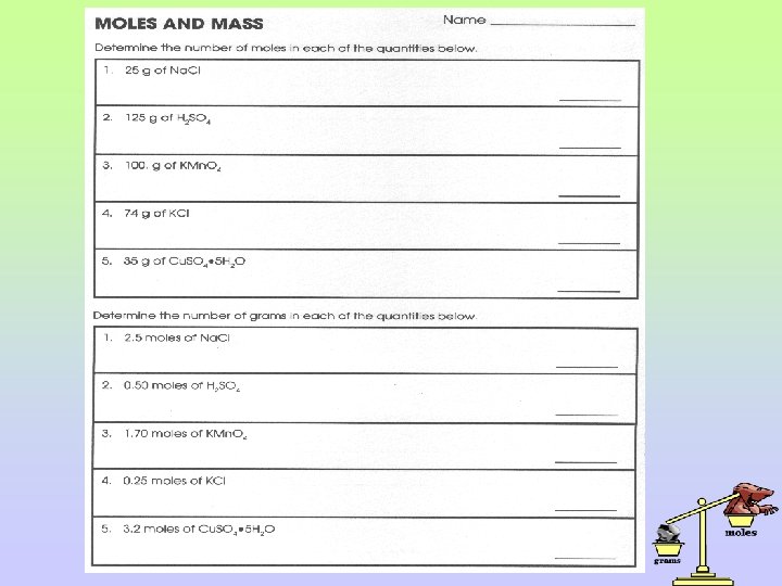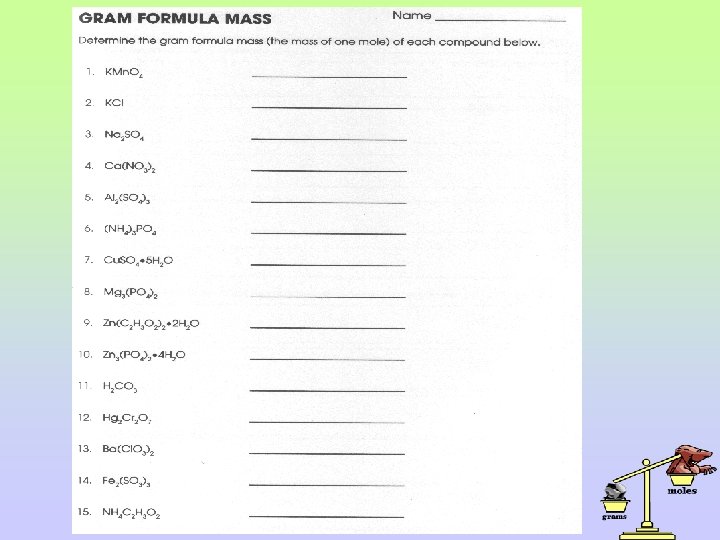 2. Find the mass of each of the following, expressed in grams. a. 1. 00 mol of HC 2 H 3 O 2 b. 2. 50 mol of K 2 Cr. O 4 c. 0. 50 mol of Ca(Cl. O 3)2 d. 0. 25 mol of Ba(NO 3)2 e. 0. 375 mol of Na 2 Cr 2 O 7 f. 0. 25 mol of Na. C 2 H 3 O 2 g. 0. 152 mol of H 3 PO 4 h. 0. 0582 mol of Li 2 SO 4 i. 0. 418 mol of Fe(NO 3)3 j. 1. 872 mol of Cu(C 2 H 3 O 2)2