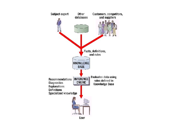 Types of Information Systems – Expert Systems • An expert system is a specialized information system that performs tasks normally done by people, such as making decisions. • Expert systems are used to approve bank loans, make large-scale purchasing decisions, and assist with medical diagnoses. • Expert systems rely on huge, detailed databases (knowledge bases). Special software, called an inference engine, analyzes data to answer questions or make choices.
