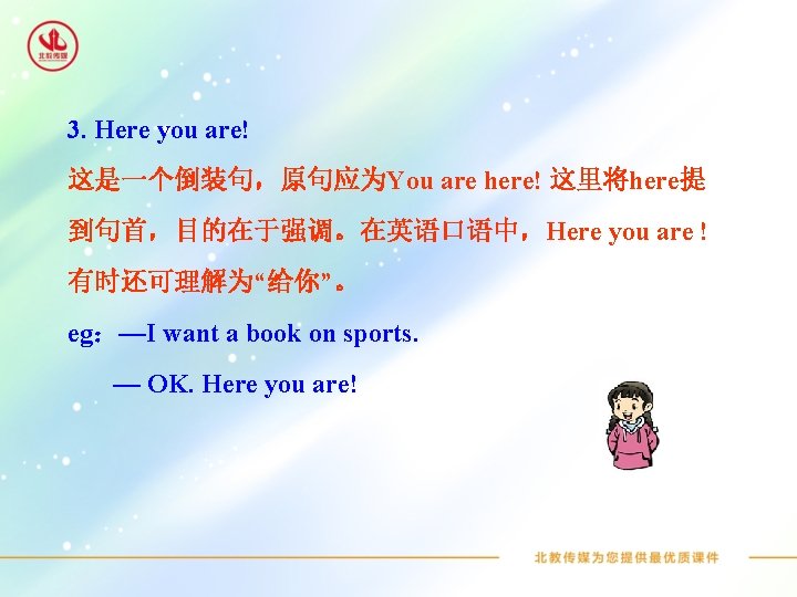 Presentation Language notes: 1. Turn left after you pass the seventh tree, and walk until you see the movie theatre. until = till 作连词,引导时间状语从句。当主句是将来时 或祈使句时,从句的谓语动词要用一般现在时而不用将来 时。 eg: I’ll stay here until the rain stops.