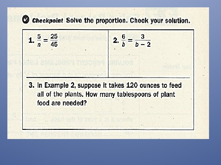 Ex/ 2: Write and solve a proportion. To feed your plants, you need to mix 3 tablespoons of plant food with 16 ounces of water. If it takes 80 ounces of water to feed all of your plants, how may tablespoons of plant food are needed? Step 1: Write the proportion. BE CONSISTENT!!!! Step 2: Solve the proportion.