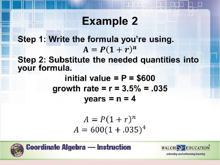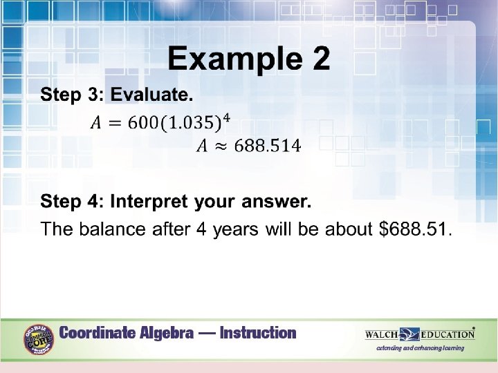 Example 2 A principal of $600 is deposited in an account that pays 3. 5% interest compounded yearly. Find the account balance after 4 years.