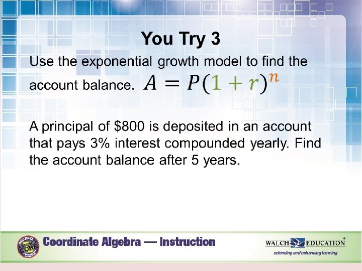 You Try 2 Use the exponential growth model to find the account balance. A principal of $450 is deposited in an account that pays 2. 5% interest compounded yearly. Find the account balance after 2 years.