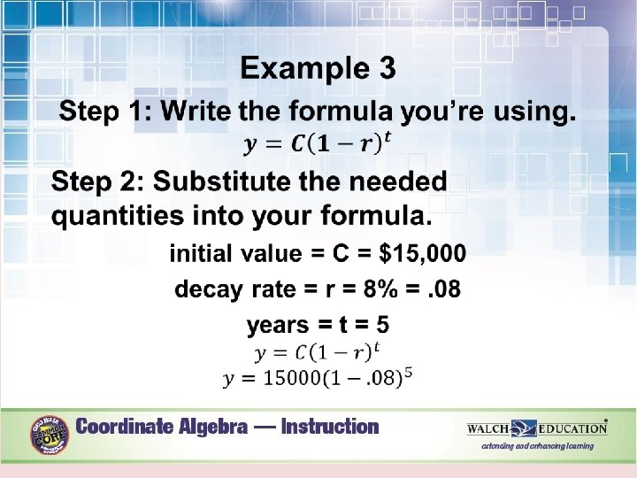 You Try 4 -5 Use the exponential decay model to find the account balance. 4. Use the exponential decay model in example 3 to estimate the value of your truck in 7 years. 5. Rework example 3 if the truck depreciates at the rate of 10% per year.