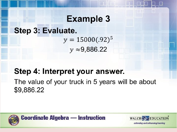 Example 3 You bought a used truck for $15, 000. The value of the truck will decrease each year because of depreciation. The truck depreciates at the rate of 8% per year. Estimate the value of your truck in 5 years.