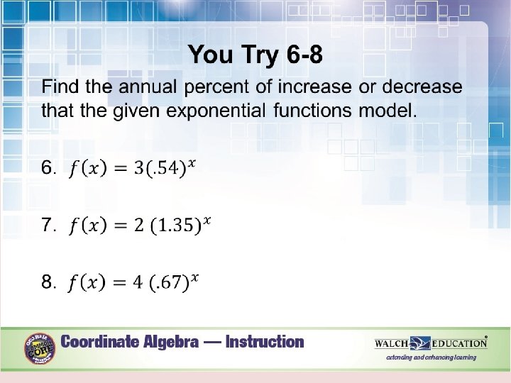 Annual Percent of Decrease Example 5: Find the annual percent of increase or decrease that f(x) = 3(0. 80)x models Step 1: Identify if it’s a growth or a decay. Since the base (0. 80) is less than 1, it’s a decay. Step 2: Look at the decay factor from the exponential formula: 1 – r and set it equal to the base 1 – r = 0. 80 Step 3: Solve the formula for r --- r =. 20 Step 4: The percent of decrease is 100 r, so substitute r for. 20 The percent of increase is 20%
