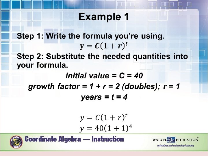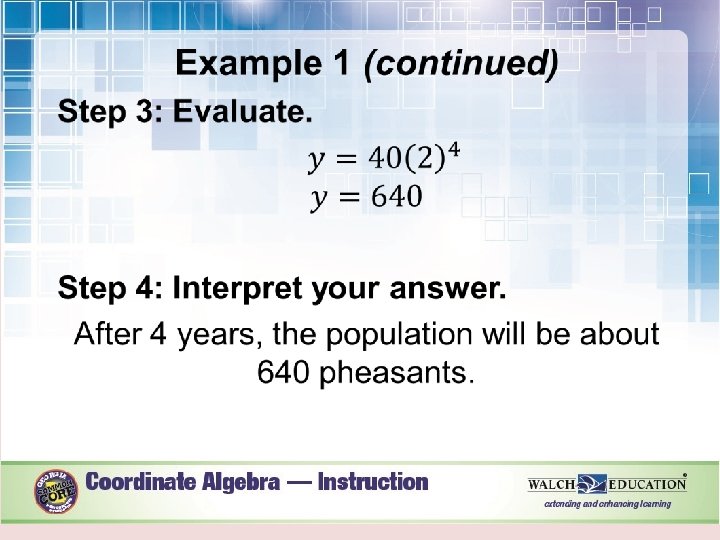 Example 1 A population of 40 pheasants is released in a wildlife preserve. The population doubles each year for 3 years. What is the population after 4 years?