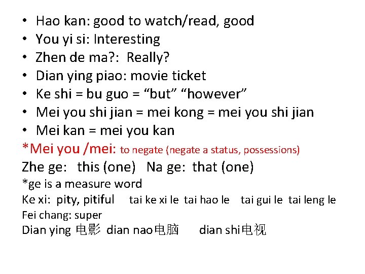 • Hao kan: good to watch/read, good • You yi si: Interesting • Zhen de ma? : Really? • Dian ying piao: movie ticket • Ke shi = bu guo = “but” “however” • Mei you shi jian = mei kong = mei you shi jian • Mei kan = mei you kan *Mei you /mei: to negate (negate a status, possessions) Zhe ge: this (one) Na ge: that (one) *ge is a measure word Ke xi: pity, pitiful tai ke xi le tai hao le tai gui le tai leng le Fei chang: super Dian ying 电影 dian nao电脑 dian shi电视