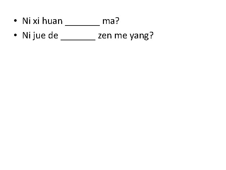 • Ni xi huan _______ ma? • Ni jue de _______ zen me yang?