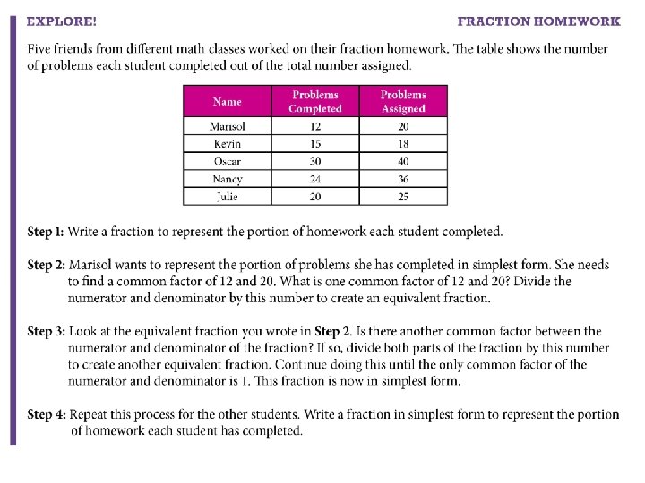 Vocabulary � Simplest Form: A fraction where the numerator’s and denominator’s only common factor is 1.