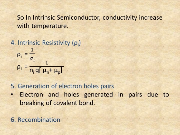 • When covalent bond is broken it will create 1 electron and 1 hole. • Hole is defined as deficiency of an electron in the broken covalent bond. • In Intrinsic Semiconductor (n = p = ni) 3. Intrinsic Conductivity σi = nq. µn + pq. µp , but(n = p = ni) σi = ni q[µn + µp] σi α ni ni α T 3/2 • Hence, ni increases with temperature as a non linear variation.