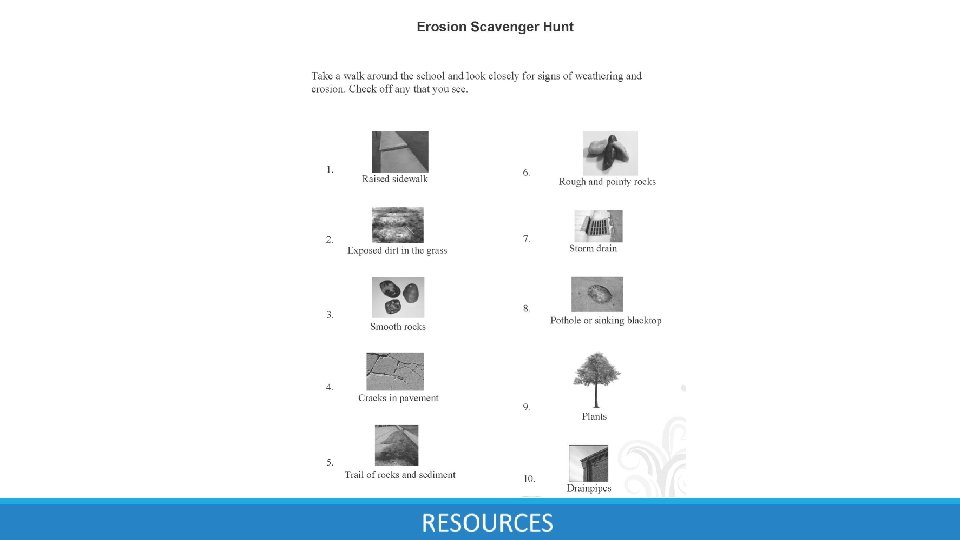 REFLECT: Erosion in Action EROSION SCAVENGER HUNT With an adult chaperone, take a walk around your house/yard and look closely for signs of weathering and erosion. (If you are unable to explore the outdoors, reflect on signs of weathering and erosion you have seen around your home or community in the past. )