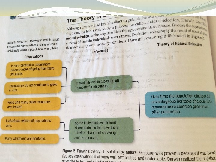 On the Origin of Species (Theory of Evolution by Natural Selection) Natural Selection - The way in which nature favours the reproductive success of some individuals within a population over others - Some individuals would have a better chance of success than others - Ex. faster cheetahs would be more likely to catch prey, stronger male lion would be more likely to defend and mate with females - If this were true and these differences were inherited, then traits of favoured individuals would become more common in the next generation and these individuals would produce more offspring - Key is to favour REPRODUCTIVE success