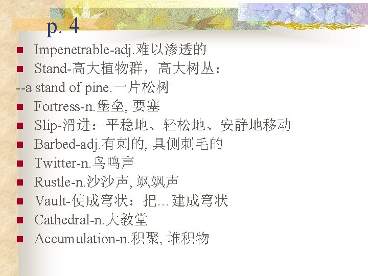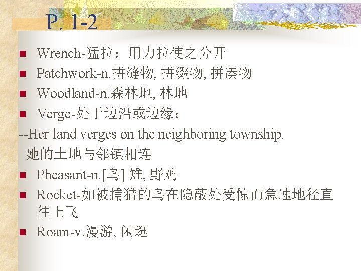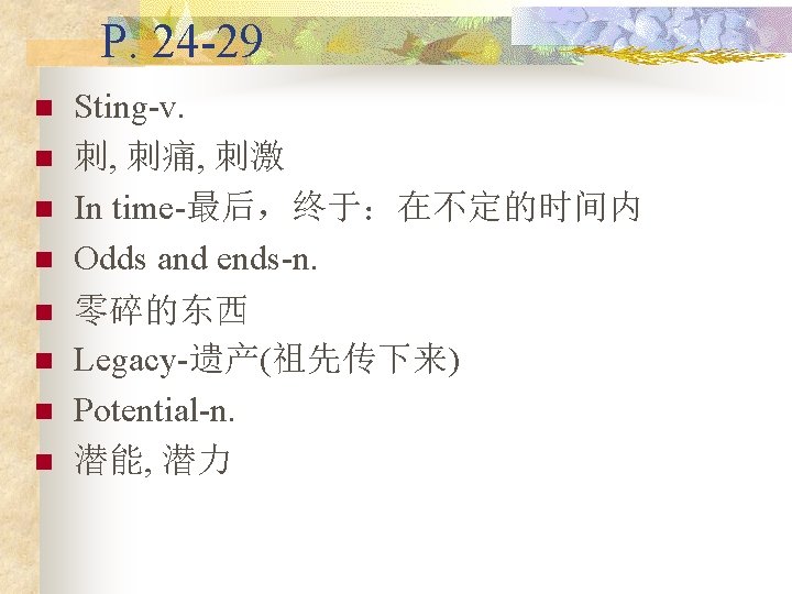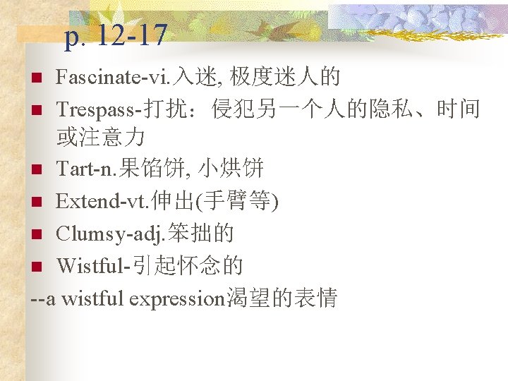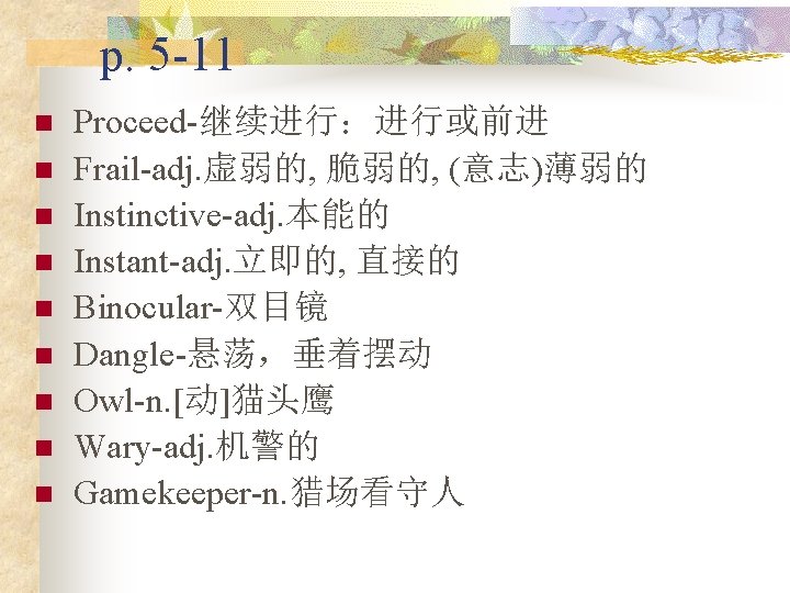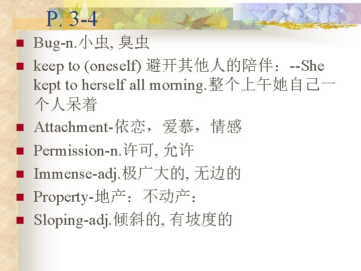 n n n 6. HIV may live in the body for years before symptom appear. 7. The moment she got home, Susan flung herself on the sofa, utterly exhausted. 8. I have a feeling that Prof. Liu doesn’t like the way some college students are dressed. 9. After the accident, the owner of the mine was made to adopt safety measures. 10. Yesterday morning, the manager went off without telling anybody, leaving secret papers all over on the desk.