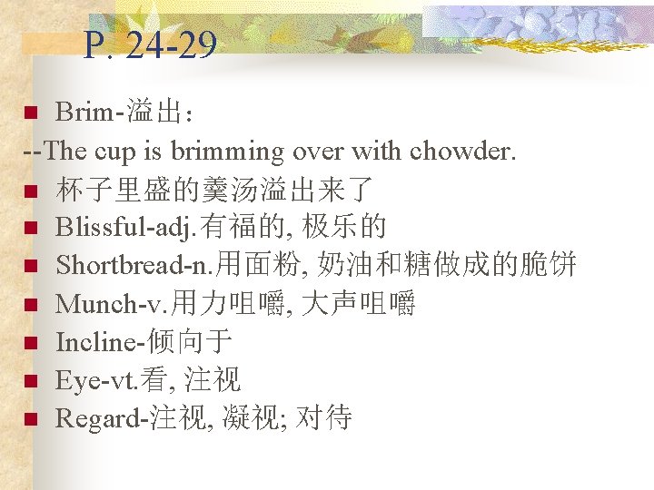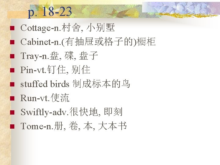 n n n 5. Old people in China today are not inclined to live with their children. 6. I am inclined to look at things from the bright side. 7. The smuggler seems to know all our actions. I suspect that someone among us is passing secret information to them. 8. She says she just doesn’t feel inclined to work today. 9. We could not identify the body because it was too badly burnt.