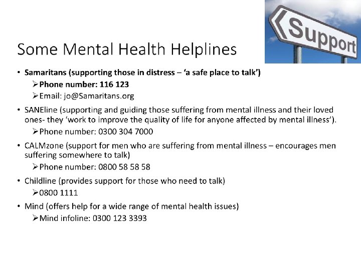 If you think you might be suffering from depression… get help • Talk to someone (friend, parent, teacher) • Make an appointment with a doctor • The Samaritans can be phoned 24/7: 116 123 www. samaritans. org