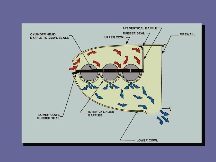 Engine Lubrication And Cooling • Cowling and baffles • Designed to force air over the cylinder cooling fins. • Direct the air close around the cylinders and prevent it from forming hot pools. • Blast tubes direct jets of cooling air onto the bottom spark plug elbows.