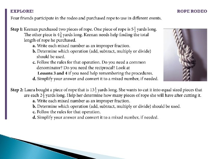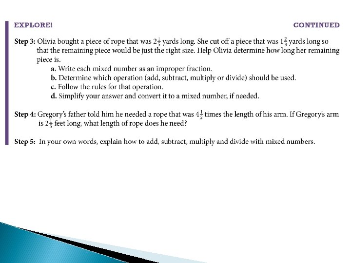 Example 2 Madison had a rope that was 8 feet long. She cut off a piece for a friend that was feet long. How much rope does she have left? � Write the problem. � Make improper fractions. � Write with the same denominator. � Subtract � Write numerators. as a mixed number. feet of rope left