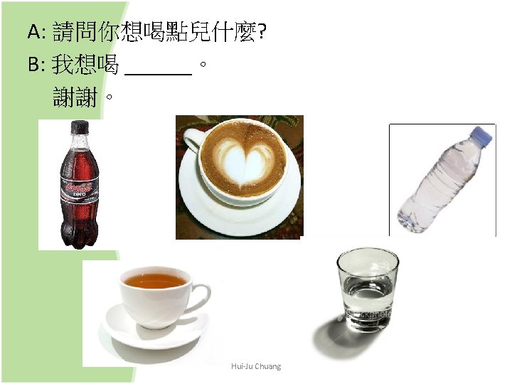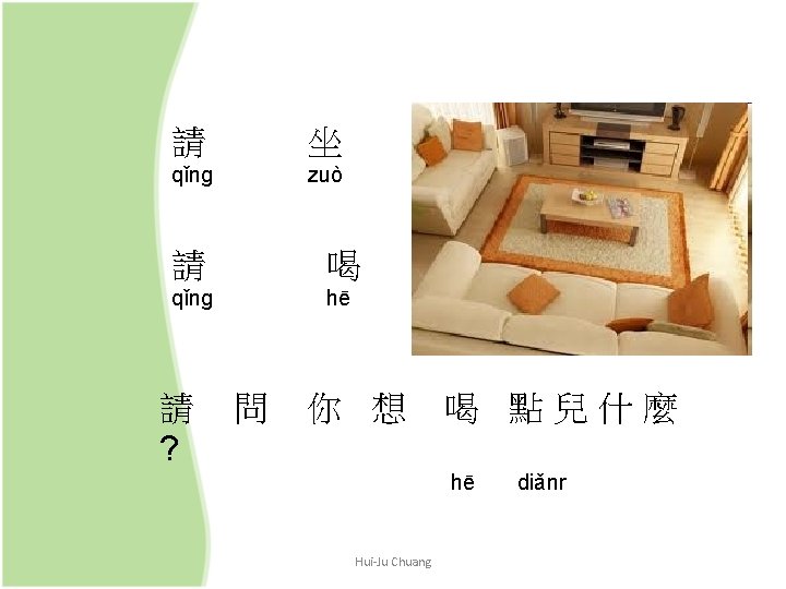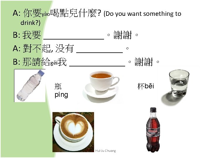 Verb + (一) 點兒 + Noun (V a bit N) (一)點兒 is used to soften the tone in a question or an imperative sentence e. g. 你想吃點兒什麼? (What would you like to eat? ) 喝點兒水吧。 (Have some water. ) Hui-Ju Chuang