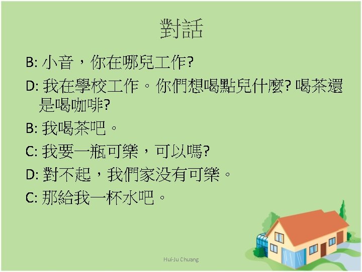 Speaking exercises 5. Where does Gao Wenzhong’s older sister work? 6. What did Wang Peng want to drink? 7. Why did Li You ask for a glass of water? Hui-Ju Chuang