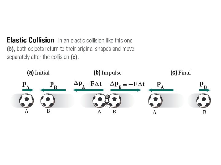 What is an elastic collision? A collision in which the total momentum and the total kinetic energy are conserved - Two billiard balls collide and then move separately after the collision • Objects collide and return to their original shape. • Kinetic energy remains the same after the collision