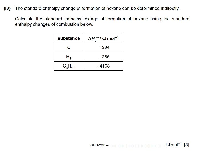 Practice question 1 b You are provided with the following enthalpy changes of combustion Substance C(s) ΔHc / k. Jmol- -394 1 H 2(g) C 4 H 10(g) C 2 H 5 OH(l) -286 -2877 -1367 Determine the enthalpy change for the following reaction: 2 C(s) + 3 H 2(g) + ½O 2(g) C 2 H 5 OH(l)