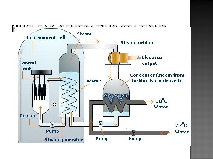 FOSSIL FUEL GENERATING STATIONS � Fossil fuel generating stations can use three main types of fuel; Oil, coal and natural gas. The gas is burned, and the chemical energy released is used to heat water and produce steam (1). � The high pressure steam is then used to turn a set of fanlike wheels called turbines (2).