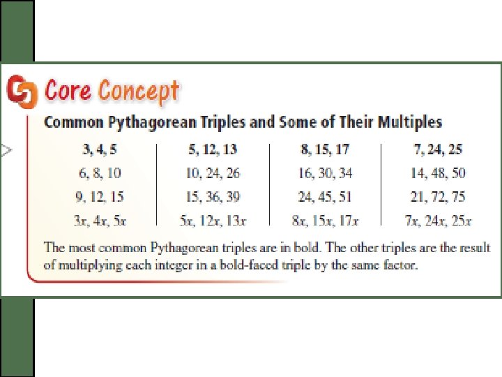 a² + b² = c² 8² + (4 5)² = 12² 64 + 80 = 144 By the Converse of the Pythagorean Theorem, a right triangle exists. a² + b² = c² 9² + (2 30)² = 14² 81 + 120 = 196 201 = 196 By the Converse of the Pythagorean Theorem, a right triangle DOES NOT exist.