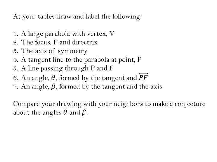 Reflective Property of Parabolas A tangent to a parabola at point P makes equal angles to: 1) A line passing through P and the focus and 2) The axis of the parabola Then these sides are congruent If these angles are congruent…