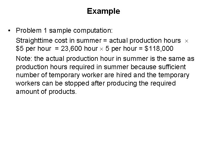 Example • Problem 1 sample computation: Straighttime cost in summer = actual production hours $5 per hour = 23, 600 hour 5 per hour = $118, 000 Note: the actual production hour in summer is the same as production hours required in summer because sufficient number of temporary worker are hired and the temporary workers can be stopped after producing the required amount of products.